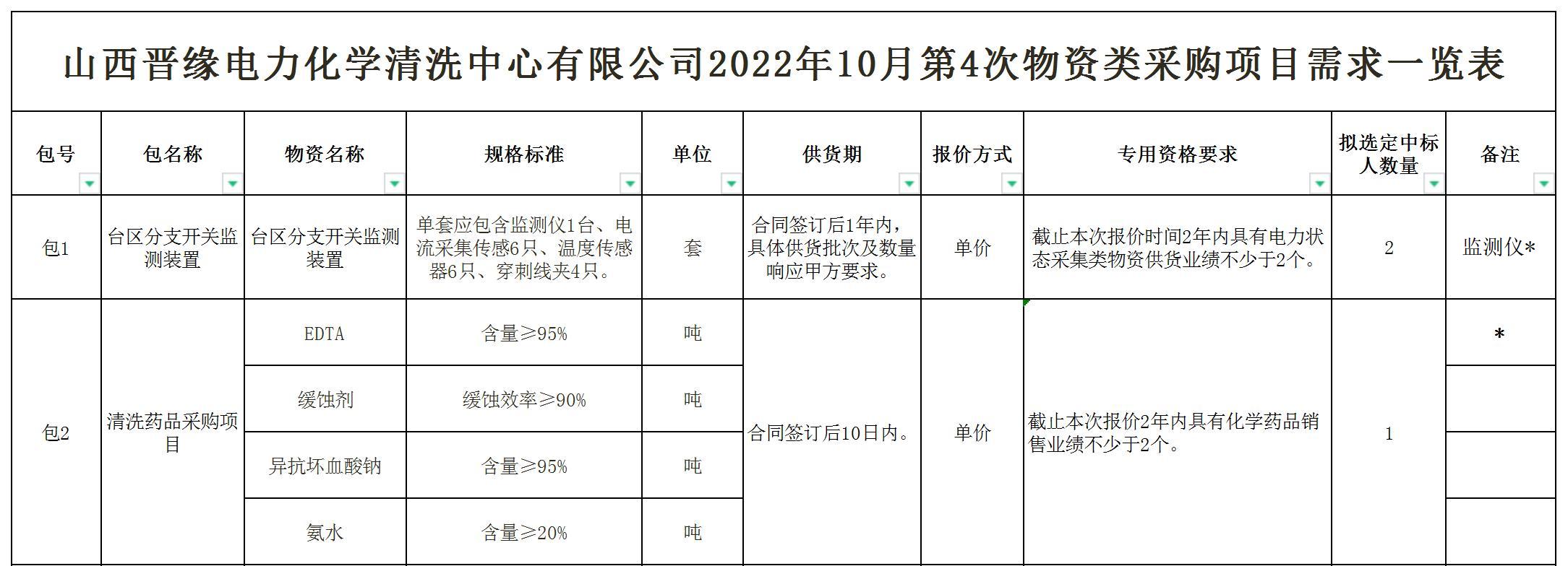 一、项目名称:山西晋缘电力化学清洗中心有限公司2022年10月第4次物资类采购项目