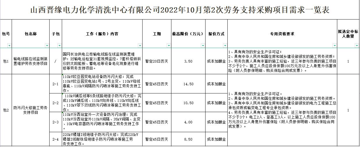 一、项目名称:山西晋缘电力化学清洗中心有限公司2022年10月第2次劳务支持采购项目